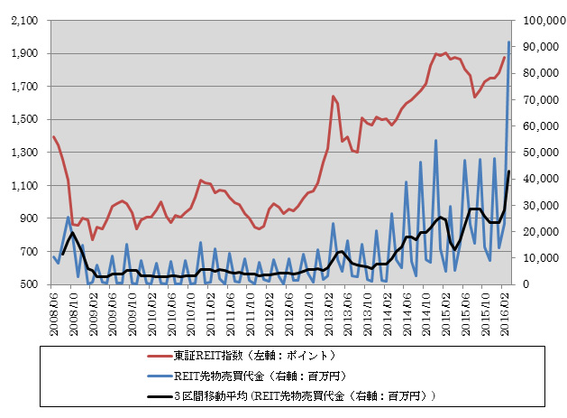 4月4日、東証が現物市場とデリバティブ市場の売買状況を発表した。それによると、まずREIT現物市場では2015年度売買代金が市場開設以来の最高額となる約10.5兆円を記録した。2016年3月の売買金額も1.27兆円と史上最高額を記録した先月に次ぐ数字を叩き出し、REIT市場の活況ぶりが改めて鮮明となった。 次にREIT先物市場では、2015年度売買代金が約3.5兆円、2016年3月売買金額が約919億円と年度、月次ともに市場開設以来の最高額を記録した(下図参照)。REIT現物の売買活発化に伴って、ヘッジや投機を目的とした資金が先物市場にも流れ込んでいることが窺える。