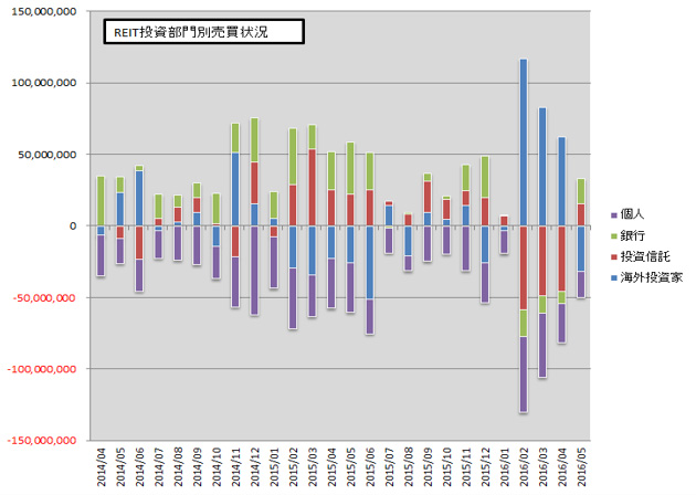 6月10日、東証より2016年5月REIT投資部門別売買状況が発表された。結果をグラフ化したのが上記の図だが、目を引くのは、2月~4月と大きく買い越していた海外投資家が、5月になって売り越しに転じたこと、そしてそれとは対照的に、2月~4月と売り手に回っていた銀行、投資信託が5月は買い手になったことだろう。