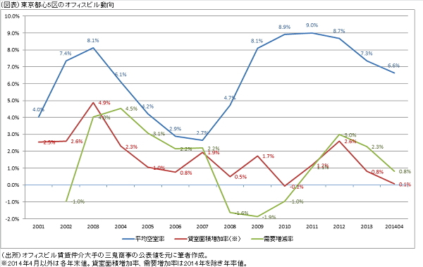 2014年4月末時点の空室率は、貸室面積が0.1%程度の増加に対して需要が0.8%増えたため、2013年末と比較して0.7%改善し6.6%となっています。空室率は年率で2.1%程度(0.7%×3)改善していますので、この傾向が続いた場合には年末に5%を切る局面も考えられます。