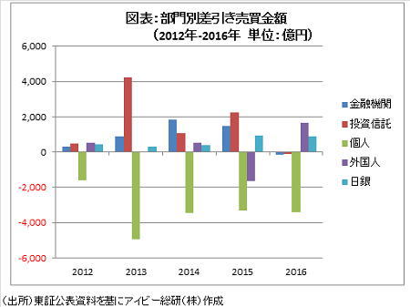 2016年の買い主体は外国人と日銀、売り主体は個人と金融機関、投資信託となりました(図表1参照)。この点は、2016年に金融機関と投資信託の動向がこれまでとは大きく異なった1年となったことを示しています。