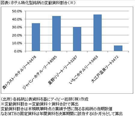 ホテル系銘柄では、ホテル売上や収益によって変動する賃料体系を採用する物件を多く保有している場合があります。その点だけを見るとMTHの賃貸収入全体に占める変動賃料の割合は、他のホテル系銘柄と比較して高いものにはなっていない(図表1)ため、収益変動リスクが低いとも考えられます。