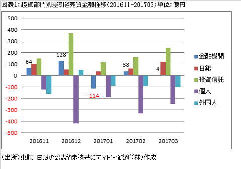 東証REIT指数は2016年11月14日の1,715ポイントから2017年1月5日の1,863ポイントまで上昇していましたので、2017年に入って投資家の売買動向が変化したことになります。この点を示したものが「図表1」のグラフです。