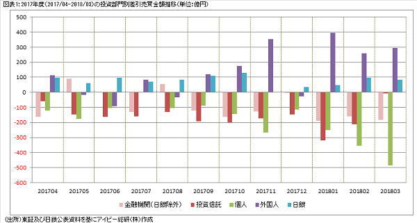 3月の投資部門別売買動向が東証より11日に公表されましたので、2017年度の売買動向(図表1参照)について記載します。