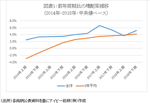 一時的に2018年上期(1月期から6月期)に減速した形になっている理由は、2017年上期に物件売却益を計上した銘柄が多かったからだ。売却益や売却損などの特殊要因を除外するために、増配率の中央値を使用しているが、それでも多くの銘柄が売却益を計上した影響が2017年上期に生じている。