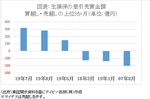 2019年4月から8月の買い越し額は800億円となった。さらに生損保の歴代買い越し額は、図表1の通り2019年5月以降に集中している。