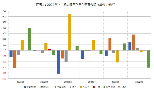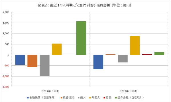 更に、図表2の通り、2021年下半期(7月~12月)と比較すると、2022年上半期(1月~6月)に投資信託は売越しから買越し、個人の売越し額は大幅に減少している。特に投資信託は、米国のインフレ抑制策が明確になった5月以降買越し額が急増しており、個人投資家の一部には米国を含めた株式市場の下落により景気悪化リスクを避けようという動きが出ていると考えられる。