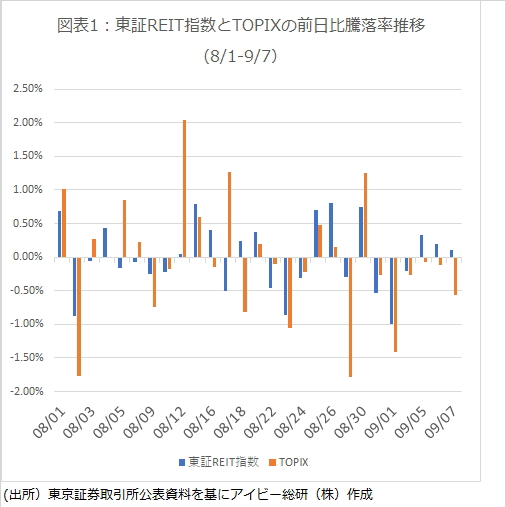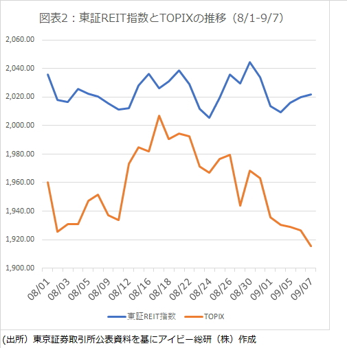 東証REIT指数はTOPIXと比較すれば時価総額で40分の1程度の規模であり、指数としては乱高下しやすい点を考慮すれば、J-REIT価格の値動きが少ないことが示されている。TOPIXは8月中旬に大幅に上昇したことも騰落率に影響しているが、TOPIXは8月の安値を9月2日以降割り込んでおり、J-REIT価格の安定性は高い状態と言えるだろう。