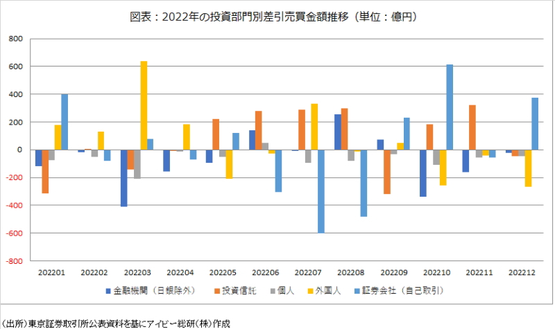 価格上昇を牽引した投資主体が外国人投資家であった。図表の通り、3月を中心に7月までは買越基調となっていた。一方で夏以降の価格下落を押しとどめた主体が、投資信託と証券会社(自己売買部門)であった。