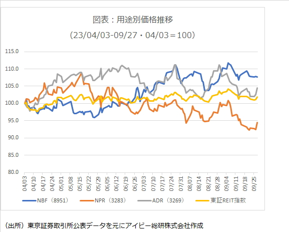 このようにオフィス賃貸市場が想定ほど悪化しない可能性が浮上する中で、オフィス系銘柄の価格上昇がJ-REIT価格を支えている状態となっている。図表はNBFと時価総額が用途の中で最も大きい物流系の日本プロロジスリート投資法人(NPR)、住居系のアドバンス・レジデンス投資法人(ADR)の価格動向を東証REIT指数と比較したものになっている。