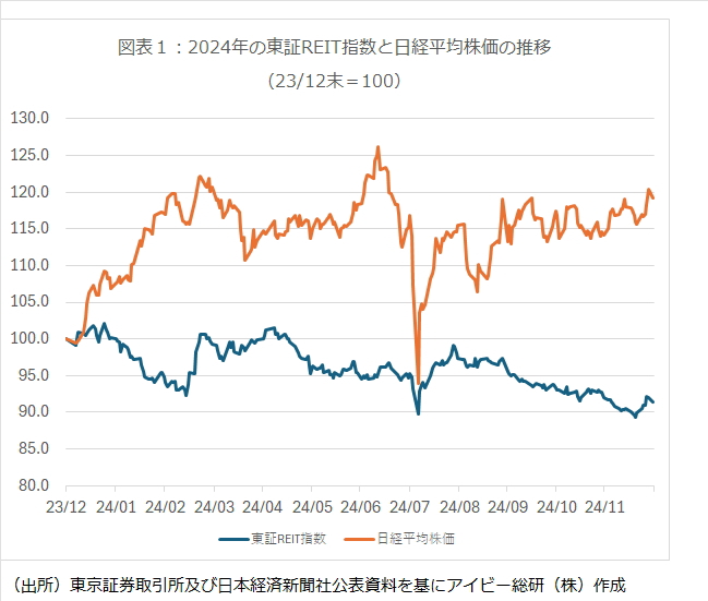 また株式と比較すると、J-REIT価格の低迷が目立つ1年でもあった。図表1の通り、日経平均株価は8月に急落する場面もあったが、2023年末と比較して15%以上高い水準で推移する期間が長く、年末時点では20%弱上昇した。