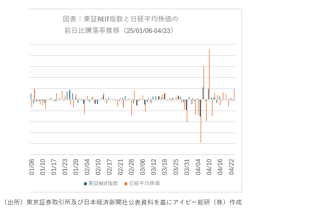 一方で、株式市場は値動きが荒い状態になっている。日経平均株価は3月24日の37,608円から4月23日には34,868円まで下落しているだけでなく、図表の通り、J-REIT価格と比較すると変動率が高い状態となっている。