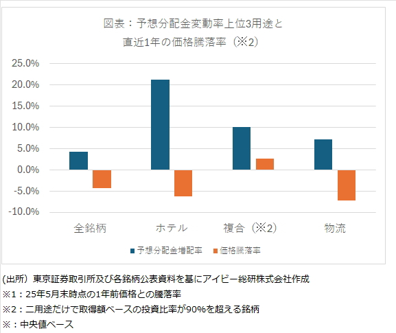 利回りを支える分配金は、増配基調が続いている。図表は2025年5月末時点の各銘柄の予想分配金を1年前(2024年6月3日時点)と比較した変動率と価格騰落率を示している。好調な賃貸市況と高値が続く売買市況により、全銘柄の中央値は4.2%増配予想となっている。