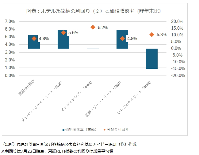 図表の通り、価格動向を見ると、銘柄間で強弱がある状態となっているが、分配金利回りではHRRが辛うじて市場平均と同程度であり、その他のホテル3銘柄は市場平均を超える利回りとなっている。投資家から見れば、ホテル系銘柄はJ-REIT市場では投資リスクが高いと判断されていることになるだろう。