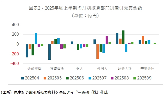 図表1の通り、2025年度上半期(4月~9月)の差引売買金額で見ると、最大の買い手は月平均で90億円を超える買い越しとなった証券会社であった。次いで事業会社が75億円の買い越しとなっているが、その他の投資部門売り越しとなっている。