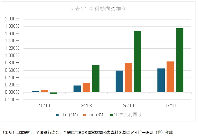 日銀の金融正常化に伴い、国内の長短金利は上昇している。日銀によるマイナス金利政策導入後の2016年10月末時点では、短期金利の目安となるTIBOR(東京銀行間取引金利)は辛うじて金利がある状態で、10年債利回りはマイナス0.05%であった。また日銀が金融政策の正常化を始めた2024年3月末時点のTIBORや10年債利回りは2025年10月末時点より低く、2025年10月末の金利水準は2007年10月頃と同じ水準となっている(図表1)。