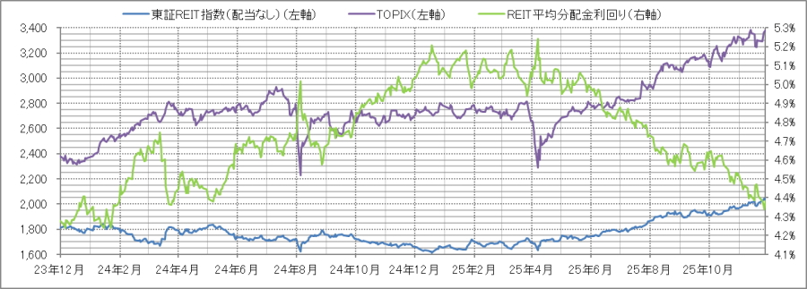 <東証REIT指数と予想分配金利回りの推移> (グラフは2023年11月~2025年10月の24ヶ月間)