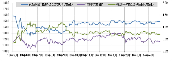 <東証REIT指数と予想分配金利回りの推移> (グラフは2013年5月~2014年4月の12ヶ月間)