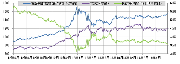 <東証REIT指数と予想分配金利回りの推移> (グラフは2012年6月~2014年5月の24ヶ月間)