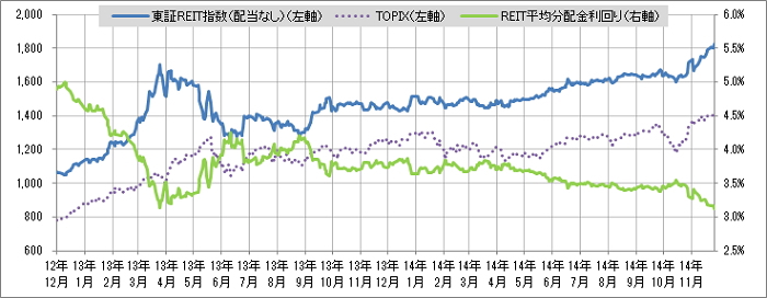 REIT指数と予想分配金利回りの推移>  (グラフは2012年12月~2014年11月の24ヶ月間)