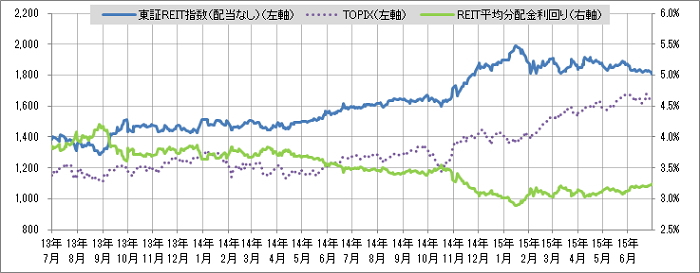 <東証REIT指数と予想分配金利回りの推移> (グラフは2013年7月~2015年6月の24ヶ月間)