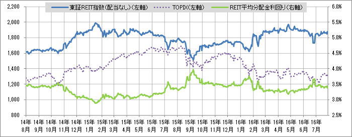 <東証REIT指数と予想分配金利回りの推移> (グラフは2014年8月~2016年7月の24ヶ月間)