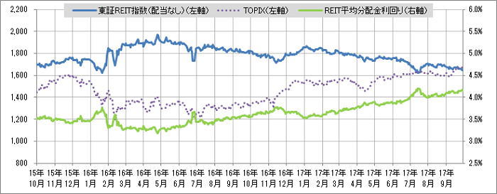 <東証REIT指数と予想分配金利回りの推移> (グラフは2015年10月~2017年9月の24ヶ月間)