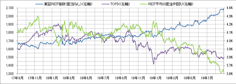 <東証REIT指数と予想分配金利回りの推移> (グラフは2017年9月~2019年8月の24ヶ月間)