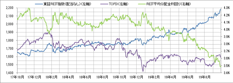 <東証REIT指数と予想分配金利回りの推移> (グラフは2017年10月~2019年9月の24ヶ月間)