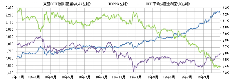 一方、東証REIT指数の上昇に伴い、REIT全体の平均分配金利回りは一時3.38%と、2016年7月以来3年3ヶ月ぶりの低水準となった。