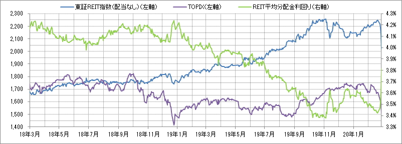 <東証REIT指数と予想分配金利回りの推移> (グラフは2018年3月~2020年2月の24ヶ月間)