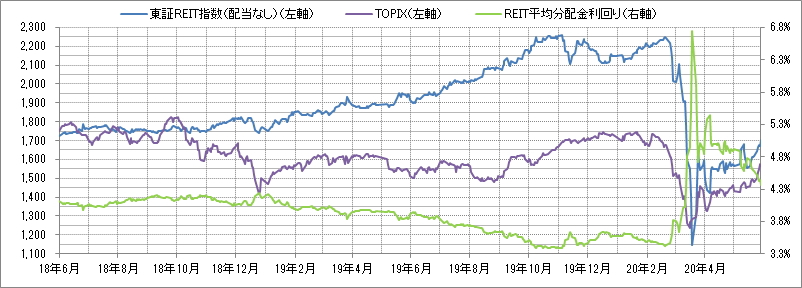 <東証REIT指数と予想分配金利回りの推移> (グラフは2018年6月~2020年5月の24ヶ月間)