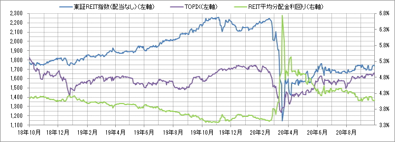 <東証REIT指数と予想分配金利回りの推移> (グラフは2018年10月~2020年9月の24ヶ月間)