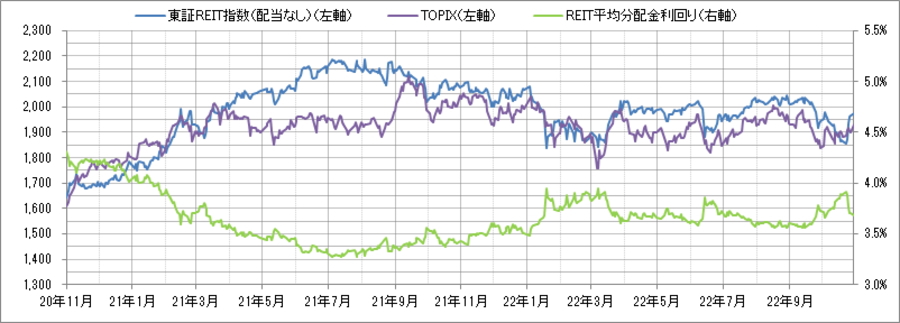 <東証REIT指数と予想分配金利回りの推移> (グラフは2020年11月~2022年10月の24ヶ月間)