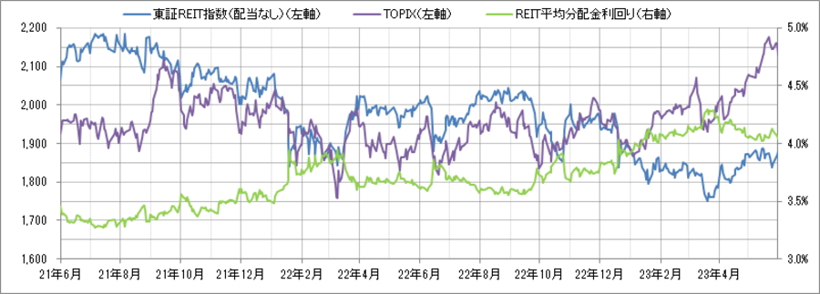 <東証REIT指数と予想分配金利回りの推移> (グラフは2021年6月~2023年5月の24ヶ月間)