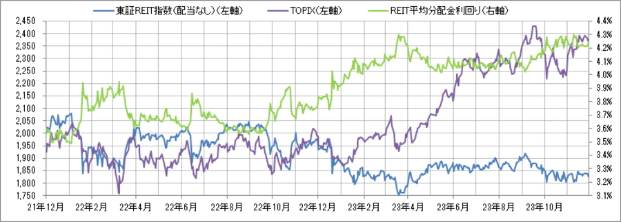 <東証REIT指数と予想分配金利回りの推移> (グラフは2021年12月~2023年11月の24ヶ月間)