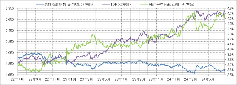 <東証REIT指数と予想分配金利回りの推移> (グラフは2022年7月~2024年6月の24ヶ月間)