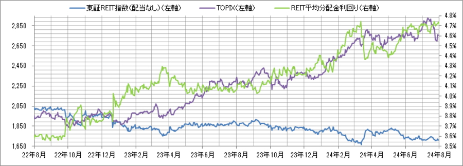 <東証REIT指数と予想分配金利回りの推移> (グラフは2022年8月~2024年7月の24ヶ月間)