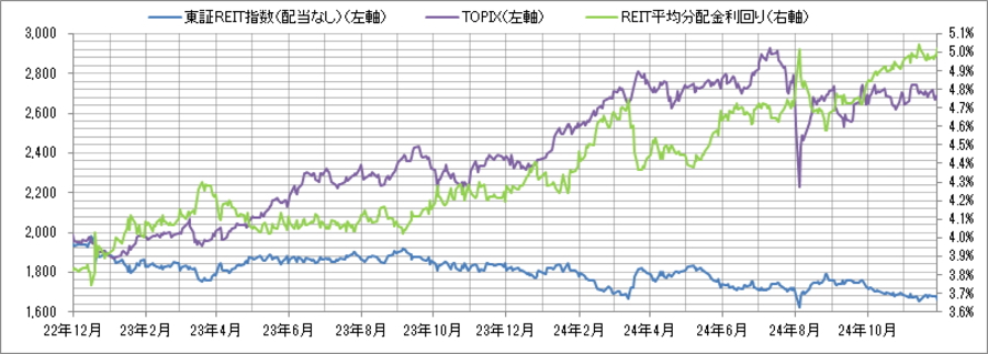<東証REIT指数と予想分配金利回りの推移> (グラフは2022年12月~2024年11月の24ヶ月間)