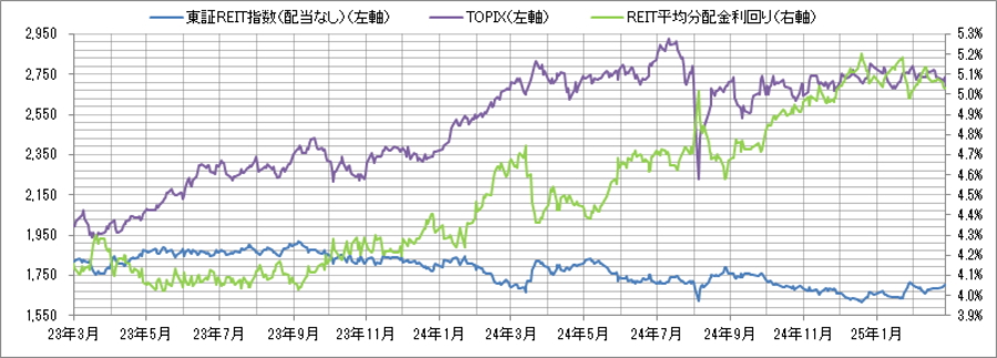 <東証REIT指数と予想分配金利回りの推移> (グラフは2023年3月~2025年2月の24ヶ月間)