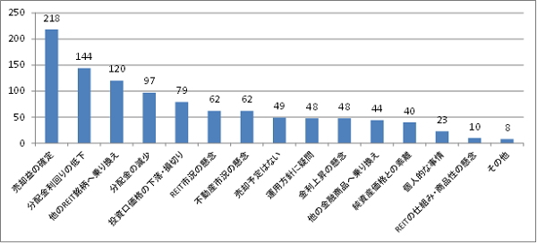 売却する要因として最も多いのは、「売却益の確定」となり、インカムゲイン投資を期待するも、投資口価格が上昇すれば、売却してキャピタルゲインを得る意向を示す。また、次点に、「分配金利回りの低下」「他銘柄へ乗り換え」と続く点から、投資口価格の上昇又は分配金の低下により分配金利回りが低下すれば、投資効率の高い他銘柄へ乗り換える行動が予測できる。一方、昨年と比較して、REIT市況や不動産市況のリスクに関する項目が後退している点から、REITを取り巻く投資環境への懸念は薄れ、一定の安心感が保たれているとみられる。
