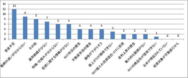 REIT投資の未経験者がREITに投資しない理由として「資金不足」が一番多いが、次点に「銘柄の違いが分からない」が位置する。全46銘柄ある中で、銘柄の特性をより打ち出すこと、銘柄を比較して違いを示すことが求められよう。
