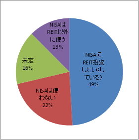 2014年から導入されたNISAを活用したい(している)層は全体の62%。更に全体の50%がREITに活用する可能性を示唆しており、分配金非課税により投資効率が高まるメリットは大きいと言える。一方、NISAは使用しないとする層も全体の22%に上る。NISAへの理解は浸透しながらも、積極的な活用は限定的であることから、制度に改善の余地も残す。