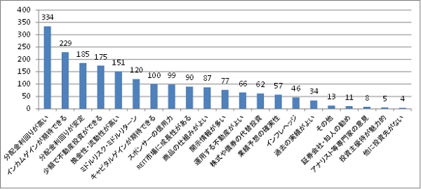 昨年は、アベノミクス期待から3月に東証REIT指数が1,700ポイント超と急上昇した結果、キャピタルゲインを期待し「投資口価格」が2番目に挙がったが、今年は投資口価格が安定していることから、「投資口価格」のランクが低下した。このように投資口価格の推移によって、銘柄選択の仕方や指標が変化する点が窺える。