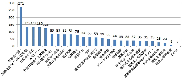 「投資口価格の売却益」が、売却する理由としてを最も多い。月間の投資口売買動向によれば、個人投資家はほぼ売越し主体となっており、その背景には、インカムゲイン投資としての魅力から長期投資を想定して投資を始めるが、投資口価格が上昇すればキャピタルゲインの魅力の方が上回るという意識が見て取れる。更に売却後はより分配金利回りの高い「他のREIT銘柄」へ資金を移動する動きも推測される。また、「分配金の減少」より「REIT市況の懸念」の回答数が昨年と逆転した背景には、賃貸市況の改善から分配金の減少リスクは減少する一方、不安定な投資口価格を受け、投資口市況への懸念材料が高まっていると見られる。