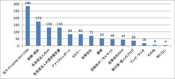 本アンケートを行っている経緯から、本サイト「JAPAN-REIT.COM」を利用する投資家が74%と高い割合を示す。続いて「新聞・雑誌」「各投資法人のホームページ」「各投資法人の運用報告書」が利用されている。