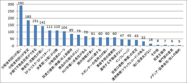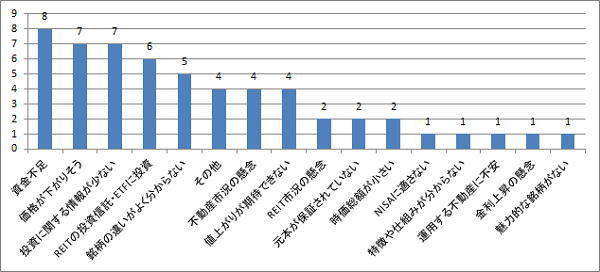 次に「投資口価格の下落リスク」「情報不足」、また投資単価の小さい点やリスク分散の観点、また銘柄の違いが分からないことを理由に「REITのETFや投資信託」で銘柄を選択しない投資を選ぶ割合も高い。