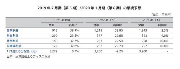 資産規模の拡大に伴い、2019年7月期(第5期)については営業収益1,213百万円(前期比32.8%増)、営業利益377百万円(同29.6%増)、経常利益233百万円(同29.5%増)、当期純利益232百万円(同29.7%増)を、また2020年1月期(第6期)は営業収益1,243百万円(同2.5%増)、営業利益343百万円(同9.0%減)、経常利益258百万円(同10.8%増)、当期純利益257百万円(同10.8%増)を予想する。