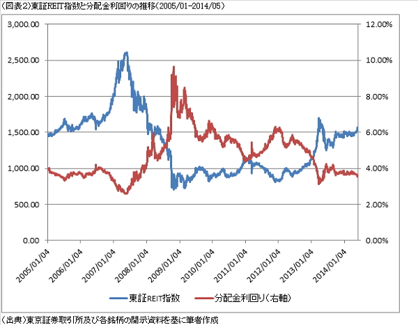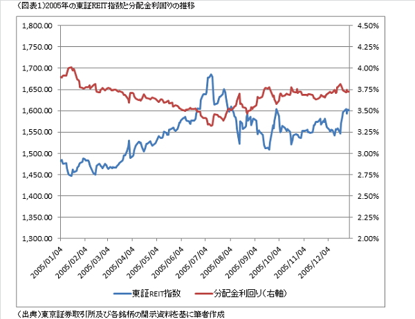 2014年の東証REIT指数と分配金利回りは、年初から5月末までの平均でそれぞれ1,487ポイント、3.7%となります。この平均値は、J-REIT市場を振り返ると2005年当時と同じ状況(図表1)となっています。特に2014年1月から6月までの動向は、2005年の同時期と似た動きになっています。