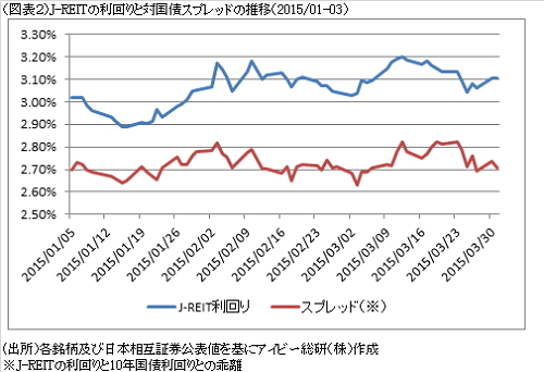 但し、国債利回りとJ-REIT利回りとの関連は、完全な相関関係となっていません。国債利回りとJ-REIT利回りとの乖離(スプレッド)は「図表2」の通りJ-REITの利回りが上昇する局面では、スプレッドが拡大する傾向を示しています。例えば1月から3月の間でJ-REIT利回りが3.17%と最も高くなった2月3日には、スプレッドは2.82%まで拡大しています。一方でJ-REIT利回りが低下する局面では、スプレッドは縮小傾向となっています。3月27日にJ-REIT利回りが3.06%まで低下した日のスプレッドは2.69%となりました。このようにスプレッドに注目すると2.70%を切ると高値感が強まり、2.80%を超えると割安感が生じる状況が続いています。