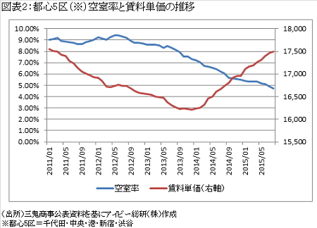 次にオフィスビルの賃貸市況ですが、こちらは「図表2」の通り2011年と2015年では様相が全く異なっています。